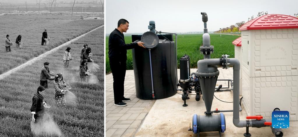 Combo photo shows people spreading fertilizer in fields in Yanshi County in the 1950s (L, photo taken by Tang Maolin), and farmer Qiu Shouxian checking a fertigation device near a field in Nanling Village of Shangshui County on April 14, 2021 (photo taken by Li An), in central China's Henan Province. Henan is an important province for agricultural production in China. Since the founding of the People's Republic of China in 1949, especially during the 40-plus years of reform and opening-up, mechanized and hi-tech farming has helped improve the quality and efficiency of agricultural business there. To date, an increasing number of farmers there are embracing advanced agricultural equipment and management process, bidding farewell to traditional arduous means of agricultural operation. (Xinhua)