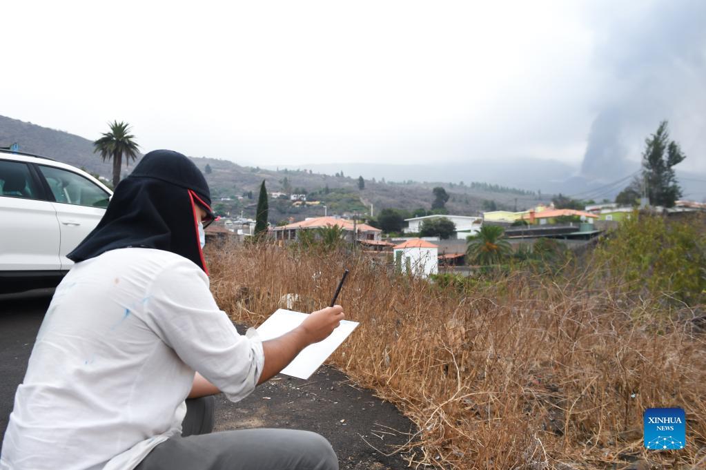 A resident draws a picture of the eruption of the Cumbre Vieja volcano on the island of La Palma in the Canary Islands, Spain, on Sept. 21, 2021. The eruption of the Cumbre Vieja volcano is expected to last between 24 and 84 days, the Volcanology Institute of the Canary Islands (INVOLCAN) said on Wednesday. (Photo by Gustavo Valiente/Xinhua)