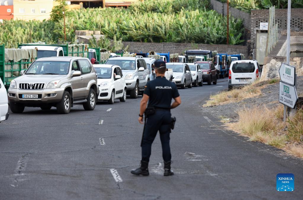 People with their vehicles wait to enter a temporary shelter on the island of La Palma in the Canary Islands, Spain, on Sept. 22, 2021. The eruption of the Cumbre Vieja volcano is expected to last between 24 and 84 days, the Volcanology Institute of the Canary Islands (INVOLCAN) said on Wednesday. (Photo by Gustavo Valiente/Xinhua)