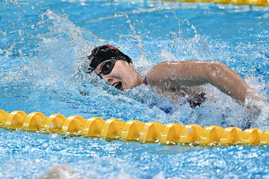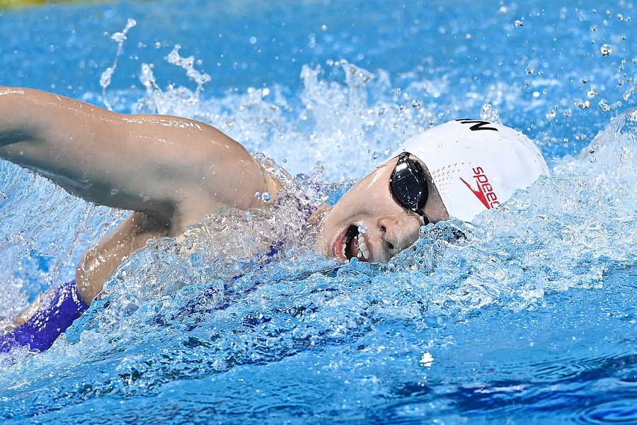 Guangdong swimmer Tang Muhan clocks 1:54.26 to set the new national record while winning the women's 200m freestyle at China's 14th National Games in Xi'an, Shaanxi Province on September 22, 2021. (Xinhua/Wu Gang)