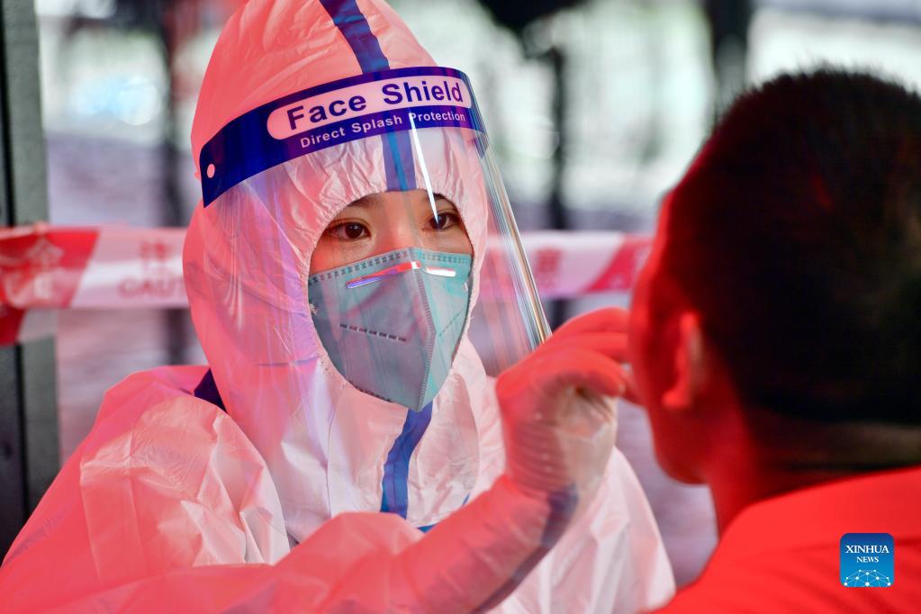 A staff member takes a swab sample for nucleic acid test at a testing point in Siming District of Xiamen, southeast China's Fujian Province, Sept. 22, 2021. Xiamen started to roll out its fourth nucleic acid test citywide on Wednesday. As of Sept. 21, a total of 194 COVID-19 cases have been reported and hospitalized in Xiamen. (Xinhua/Jiang Kehong)