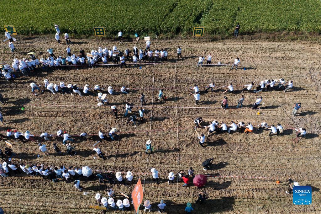 Aerial photo shows farmers participating in tug of war games in Datong Township of Jiande, east China's Zhejiang Province, Sept. 22, 2021. A sports event themed on paddy field was held in Datong on Wednesday. The games included rice harvesting, wheelbarrow race, rice-carrying relay and tug of war. (Xinhua/Xu Yu)