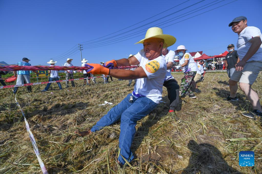 Farmers participate in a tug of war game in Datong Township of Jiande, east China's Zhejiang Province, Sept. 22, 2021. A sports event themed on paddy field was held in Datong on Wednesday. The games included rice harvesting, wheelbarrow race, rice-carrying relay and tug of war. (Xinhua/Xu Yu)
