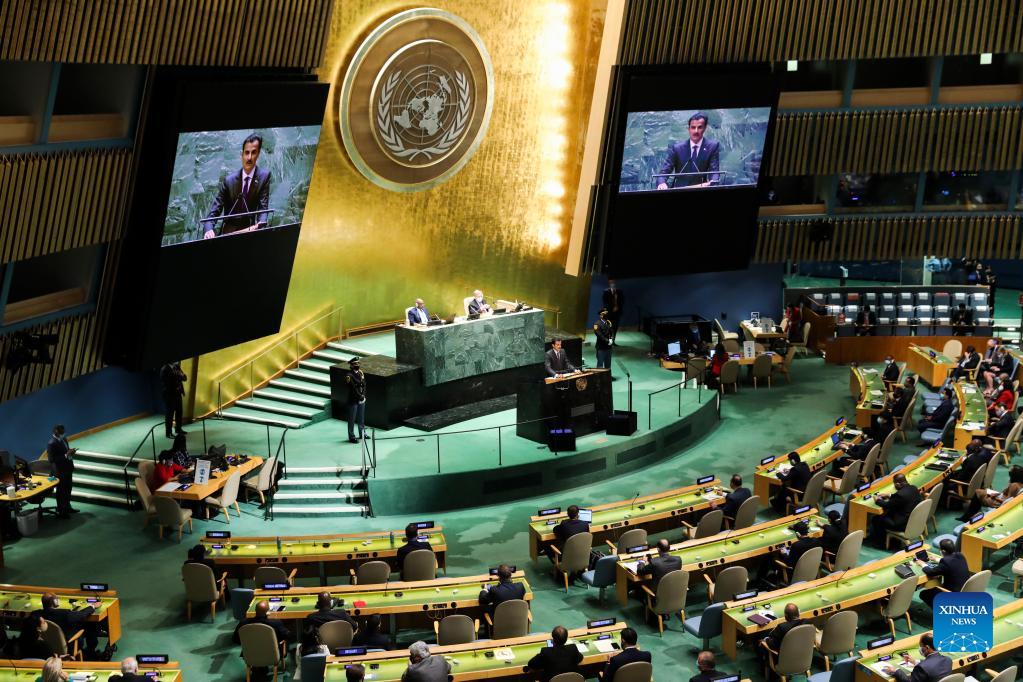 Emir of Qatar Sheikh Tamim bin Hamad Al Thani addresses the general debate of the 76th session of the United Nations General Assembly at the UN headquarters in New York, Sept. 21, 2021. The General Debate of the 76th session of the United Nations General Assembly kicked off on Tuesday. (Xinhua/Wang Ying)