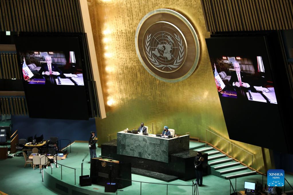 Chilean President Sebastian Pinera addresses the general debate of the 76th session of the United Nations General Assembly via video on Sept. 21, 2021. The General Debate of the 76th session of the United Nations General Assembly kicked off on Tuesday. (Xinhua/Wang Ying)