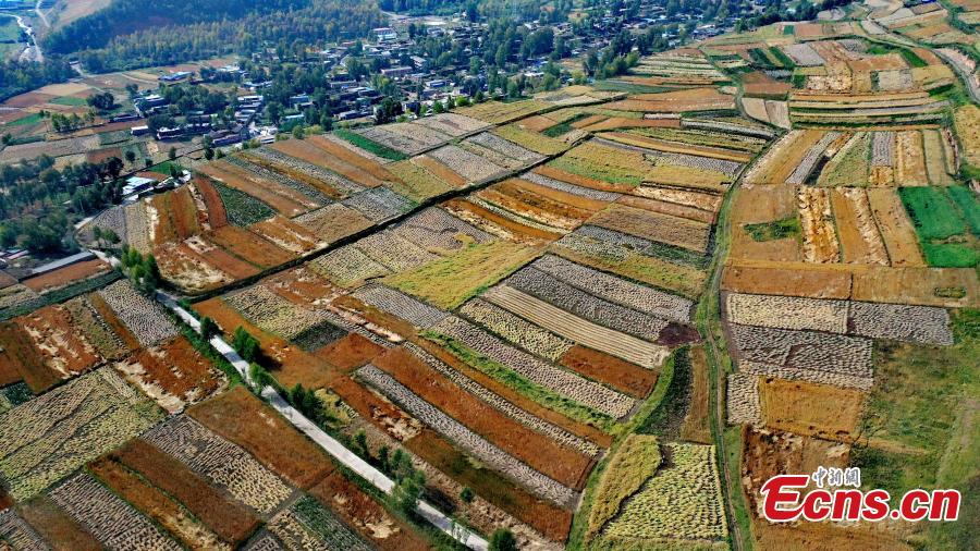 Undated aerial photo shows the colorful fields in autumn resemble an eyeshadow platelet on the plateau of northwest China’s Qinghai Province. (China News Service/Wei Tingxiang)