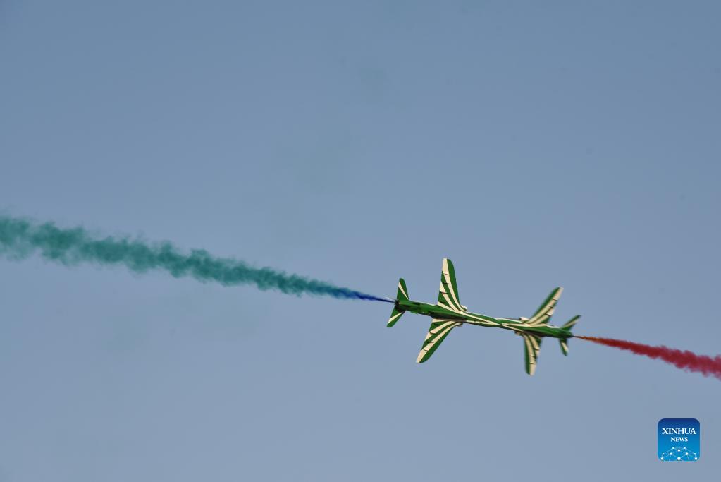 Photo taken on Sept. 22, 2021 shows the Saudi Hawks super low flight aerobatics at the Um Ajlan Park in Riyadh, Saudi Arabia. The airshow was held here on Wednesday and Thursday to celebrate the country's National Day. (Xinhua/Wang Haizhou)