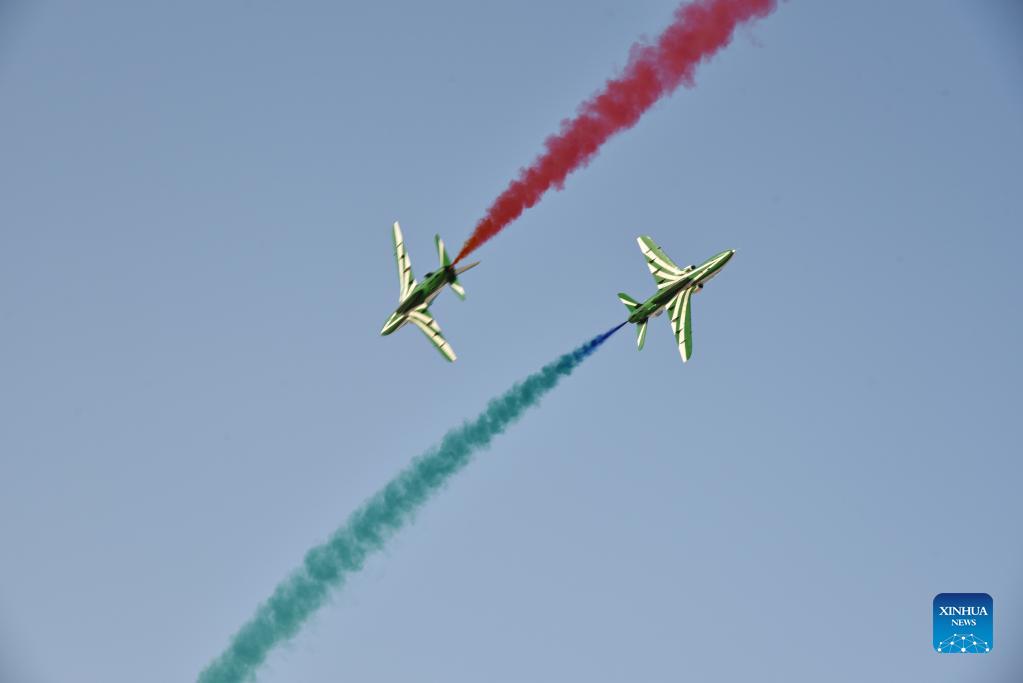 Photo taken on Sept. 22, 2021 shows the Saudi Hawks super low flight aerobatics at the Um Ajlan Park in Riyadh, Saudi Arabia. The airshow was held here on Wednesday and Thursday to celebrate the country's National Day. (Xinhua/Wang Haizhou)