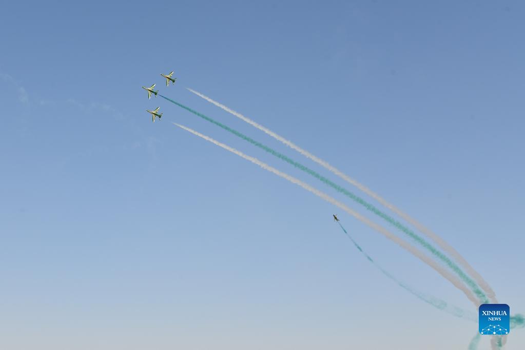 Photo taken on Sept. 22, 2021 shows the Saudi Hawks aerobatics show at the Um Ajlan Park in Riyadh, Saudi Arabia. The airshow was held here on Wednesday and Thursday to celebrate the country's National Day. (Xinhua/Wang Haizhou)