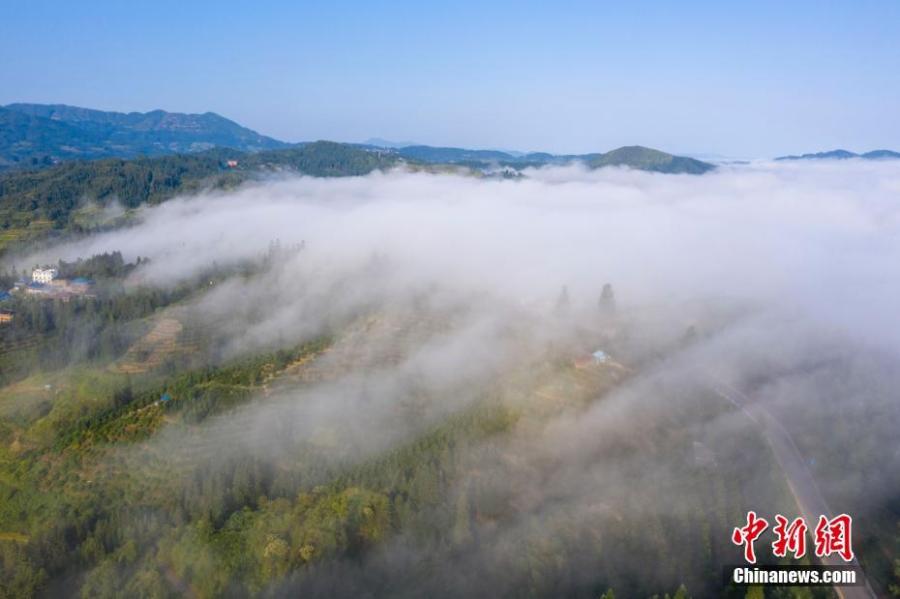 Houses, forests and roads of Datang Village, Congjiang County, southwest China’s Guizhou, are covered in advection fog, Sept. 22, 2021. (China News Service/Wu Dejun)