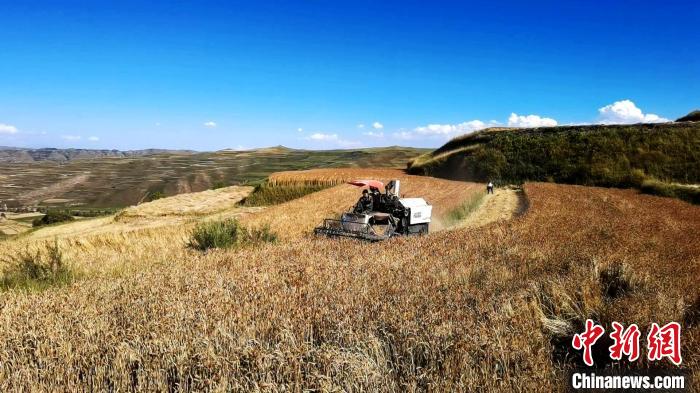 Photo shows a man driving agricultural machinery used to harvest wheat in a field. (Chinanews.com/Bao Qianqian)