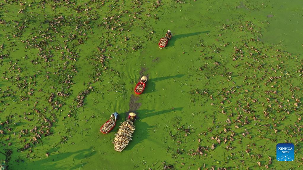 Aerial photo taken on Sept. 23, 2021 shows farmers harvesting lotus roots in Banqiao Township of Hengyang City, central China's Hunan Province. (Xinhua/Zhao Zhongzhi)