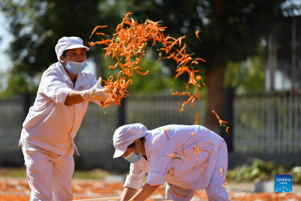 People dry chili peppers in Hengdong County of Hengyang City, central China's Hunan Province, Sept. 22, 2021. (Xinhua/Zhao Zhongzhi)