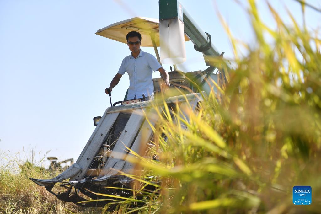 A farmer operates a machine to harvest rice in Zongqiao Township of Hengyang City, central China's Hunan Province, Sept. 22, 2021. (Xinhua/Zhao Zhongzhi)