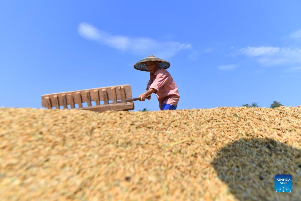 Photo taken on Sept. 23, 2021 shows a farmer drying grains in Guanling Township of Hengyang City, central China's Hunan Province. (Xinhua/Zhao Zhongzhi)