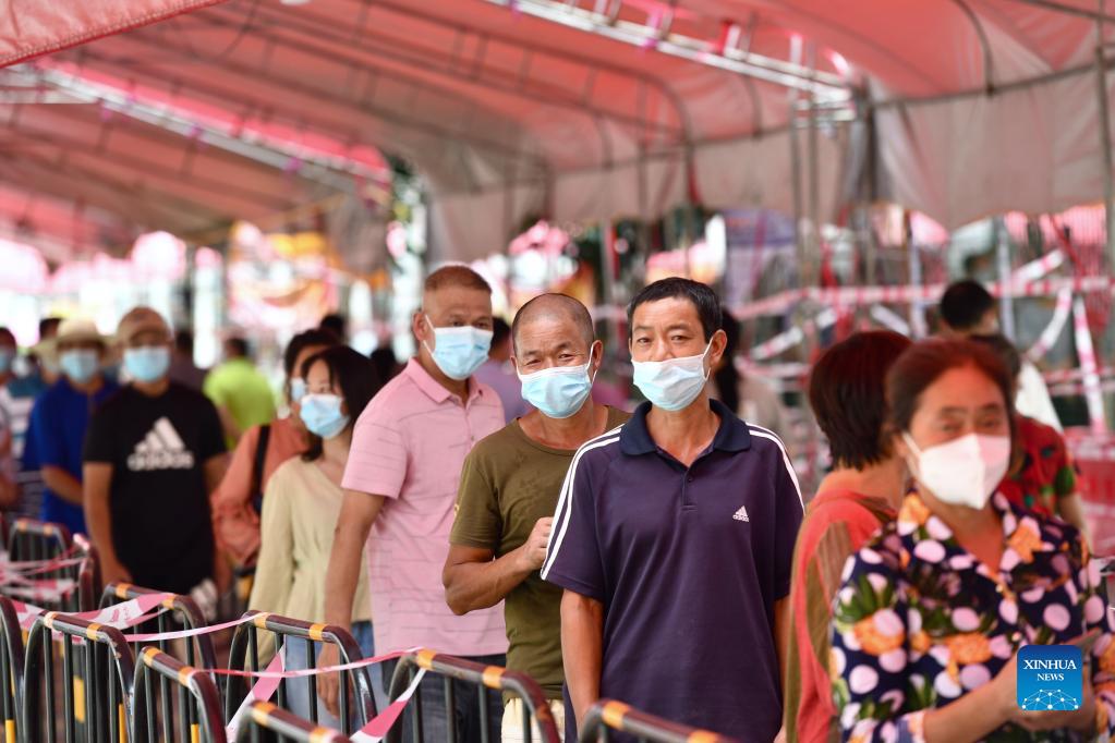 Residents wait in line to receive nucleic acid testing outside a testing site at Butang Village in Tongan District of Xiamen City, southeast China's Fujian Province, Sept. 23, 2021. Medical workers, public servants, police officers, and volunteers all over Xiamen are mobilized to help Tongan with its COVID-19 prevention and control efforts. Experts under the State Council inter-agency task force for COVID-19 response have arrived at high and medium COVID-19 risk areas in Tongan on Sept. 20 to offer their guidance. (Xinhua/Jiang Kehong)