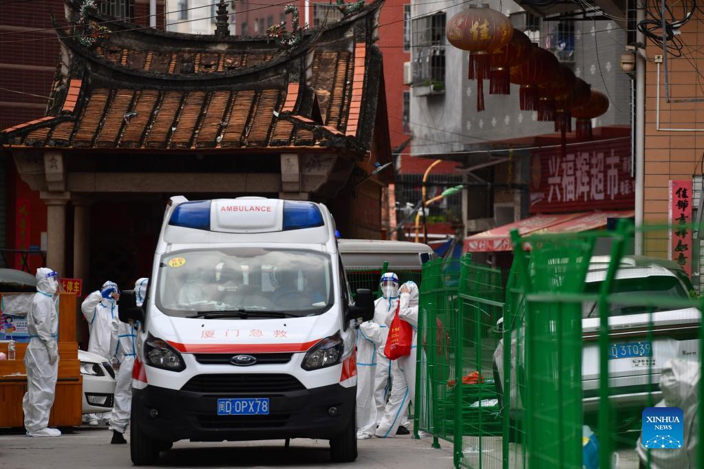 Medical workers transfer a patient with fever symptom from a lock-down area at the Xihu community in Tongan District of Xiamen City, southeast China's Fujian Province, Sept. 23, 2021. Medical workers, public servants, police officers, and volunteers all over Xiamen are mobilized to help Tongan with its COVID-19 prevention and control efforts. Experts under the State Council inter-agency task force for COVID-19 response have arrived at high and medium COVID-19 risk areas in Tongan on Sept. 20 to offer their guidance. (Xinhua/Jiang Kehong)
