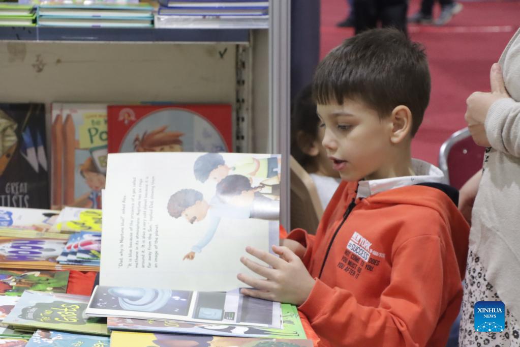 A boy reads a book at the 20th Amman International Book Fair in Amman, Jordan, on Sept. 23, 2021. The 20th Amman International Book Fair kicked off on Thursday, gathering more than 360 Jordanian and international publishing houses. (Xinhua/Ji Ze)