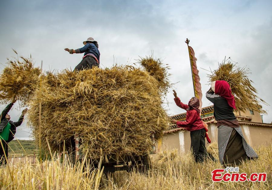 Villagers harvest highland barley from their fields in Tibetan and Qiang Autonomous Prefecture of Aba, southwest China's Sichuan Province, Sept. 6, 2021. (China News Service/Liu Guoxing)