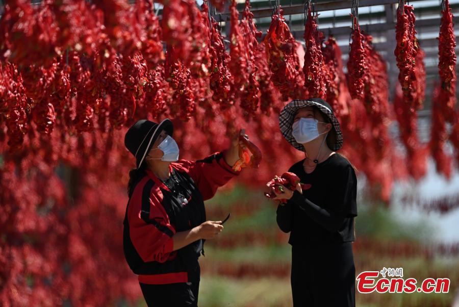 Villagers air chilies in Mongolian Autonomous Prefecture of Bayingolin, Inner Mongolia, Aug. 31, 2021. (Filephoto/China News Service)