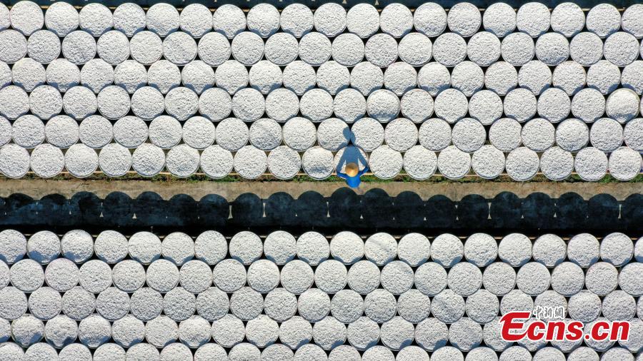 Potato flour is dried in the sun in Xianju County, Taizhou City, Zhejiang Province, Sept. 22, 2021. (China News Service/Hua Wenwu)