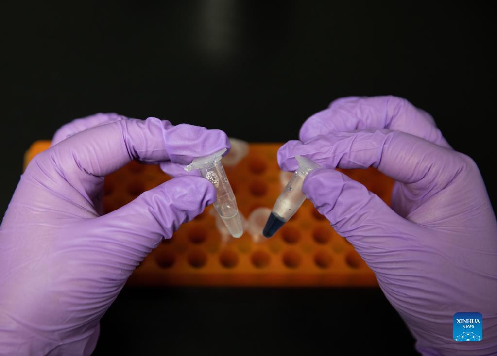 A Chinese scientist shows samples of synthesized starch at a lab of the Tianjin Institute of Industrial Biotechnology, Chinese Academy of Sciences, on Sept. 16, 2021. Chinese scientists have developed an artificial method of synthesizing starch from carbon dioxide, the first of its kind globally. The study, conducted by the Tianjin Institute of Industrial Biotechnology under the Chinese Academy of Sciences, was published in the journal Science on Friday. (Xinhua/Jin Liwang)