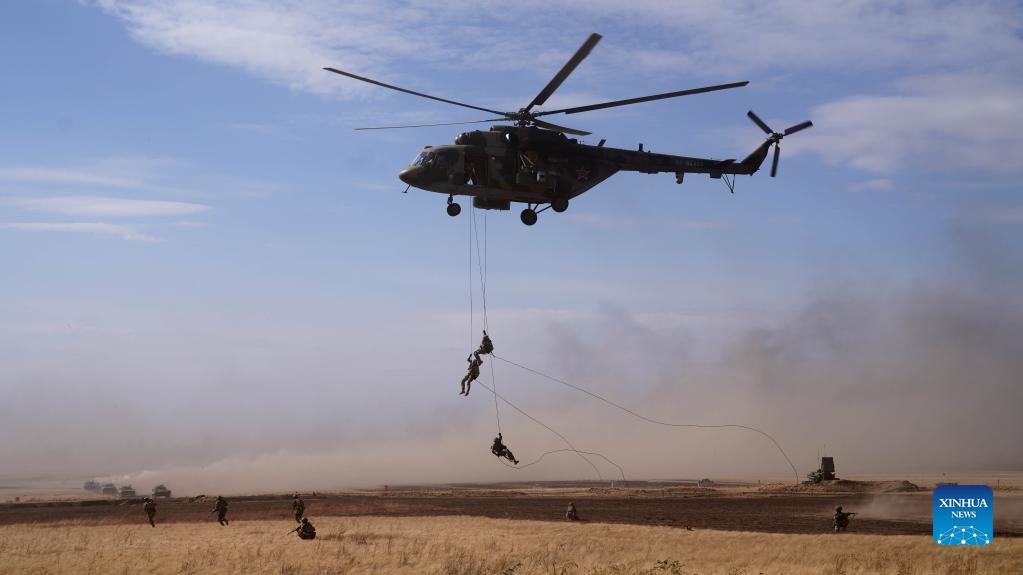 Photo taken on Sept. 23, 2021 shows the live-fire drill "Peace Mission 2021" at the Donguz training range in Orenburg, Russia. Troops participating in the "Peace Mission 2021," a counter-terrorism military exercise for Shanghai Cooperation Organization (SCO) member states, conducted a live ammunition drill at the Donguz training range in Orenburg, Russia on Thursday. (Xinhua/Mei Shixiong)