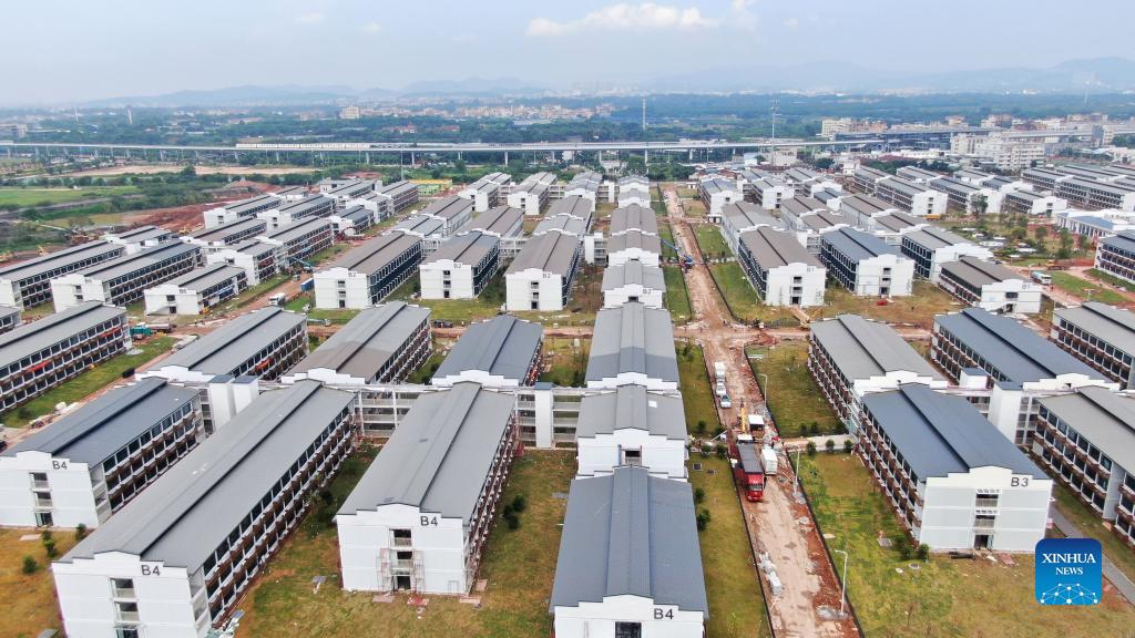Aerial photo taken on Sept. 17, 2021 shows a view of the Guangzhou International Health Station in Baiyun District, Guangzhou City of south China's Guangdong Province. The first-phase project of the Guangzhou International Health Station will be put into operation soon, offering health service to inbound travellers during their quarantine period as required by epidemic prevention and control measures. The first batch of 184 medical workers moved in on Sept. 17 to make preparations for the health service for the travellers. (Xinhua/Lu Hanxin)