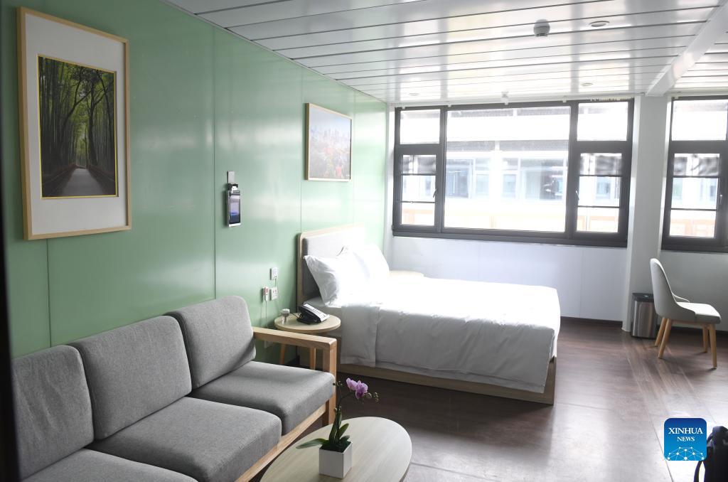 Photo taken on Sept. 17, 2021 shows an interior view of a guest room at the Guangzhou International Health Station in Baiyun District, Guangzhou City of south China's Guangdong Province. The first-phase project of the Guangzhou International Health Station will be put into operation soon, offering health service to inbound travellers during their quarantine period as required by epidemic prevention and control measures. The first batch of 184 medical workers moved in on Sept. 17 to make preparations for the health service for the travellers. (Xinhua/Lu Hanxin)