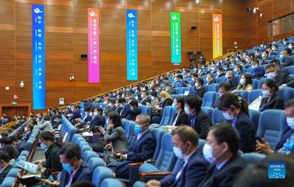 Guests and traders attend the opening ceremony of the 13th China-Northeast Asia Expo in Changchun, northeast China's Jilin Province, on Sept. 23, 2021. The 13th China-Northeast Asia Expo is held online and offline from Sept. 23 to 27 in Changchun, capital city of northeast China's Jilin Province. (Xinhua/Xu Chang)