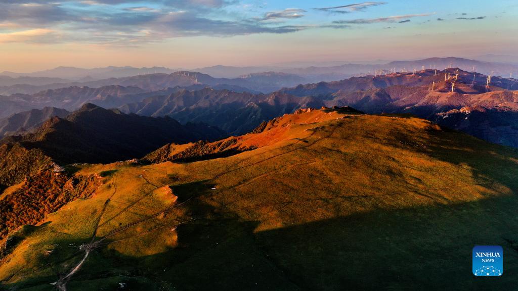 Aerial photo taken on Sept. 23, 2021 shows a view of an alpine meadow in Liuke Township, Lingqiu County, Datong City of north China's Shanxi Province. (Photo by Li Tao/Xinhua)