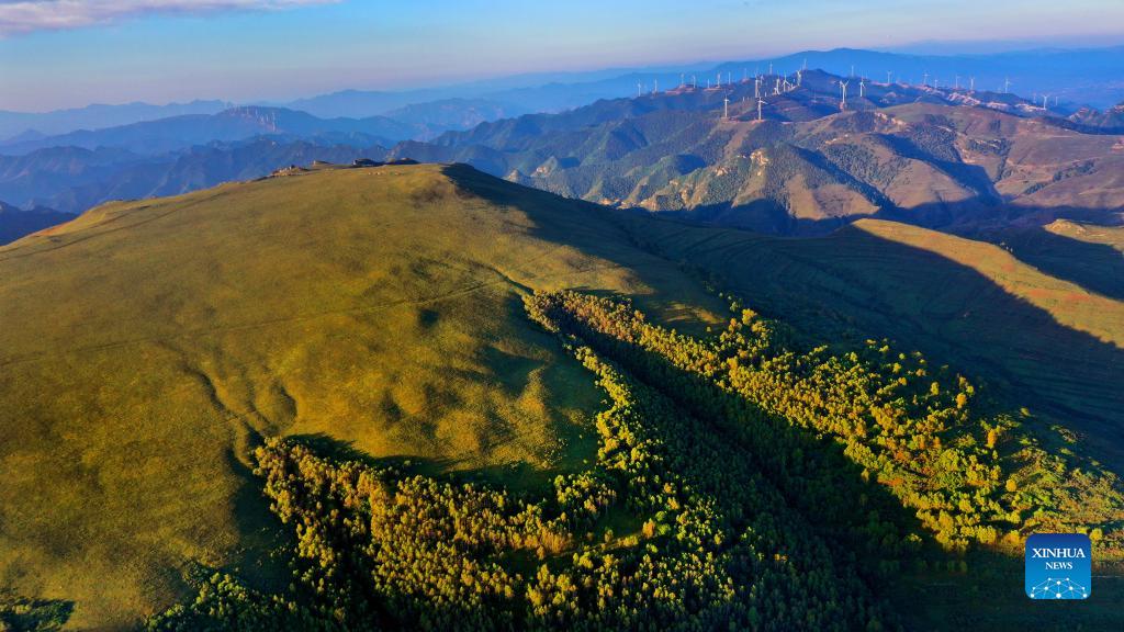 Aerial photo taken on Sept. 23, 2021 shows a view of an alpine meadow in Liuke Township, Lingqiu County, Datong City of north China's Shanxi Province. (Photo by Li Tao/Xinhua)