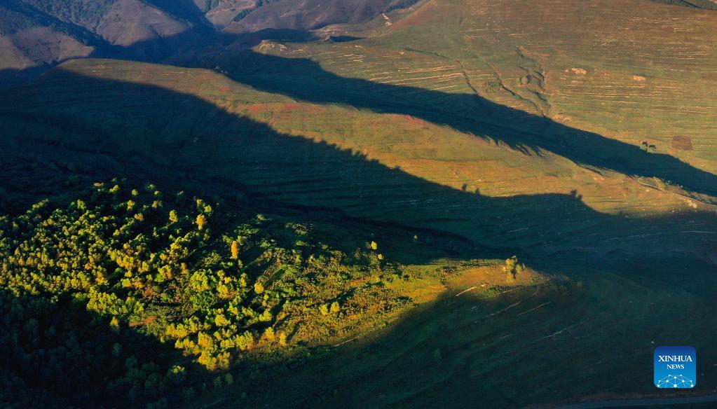 Aerial photo taken on Sept. 23, 2021 shows a view of an alpine meadow in Liuke Township, Lingqiu County, Datong City of north China's Shanxi Province. (Photo by Li Tao/Xinhua)