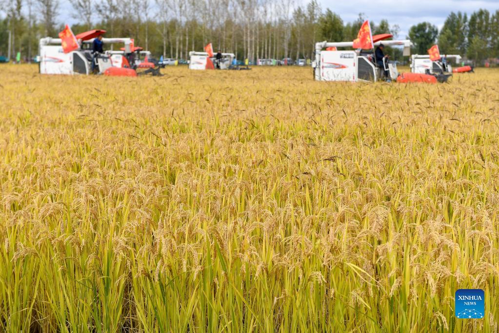 Farmers operate rice harvesters during an demonstration event in celebration of the Chinese farmers' harvest festival at Hongguang Village, Changchun City of northeast China's Jilin Province, Sept. 23, 2021. Thursday marks the Chinese farmers' harvest festival, which is celebrated on the Autumn Equinox. (Xinhua/Zhang Nan)