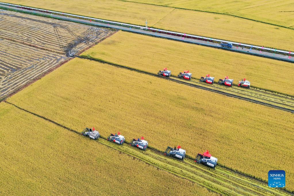 Aerial photo taken on Sept. 23, 2021 shows farmers operating rice harvesters during an demonstration event in celebration of the Chinese farmers' harvest festival at Hongguang Village, Changchun City of northeast China's Jilin Province. Thursday marks the Chinese farmers' harvest festival, which is celebrated on the Autumn Equinox. (Xinhua/Zhang Nan)