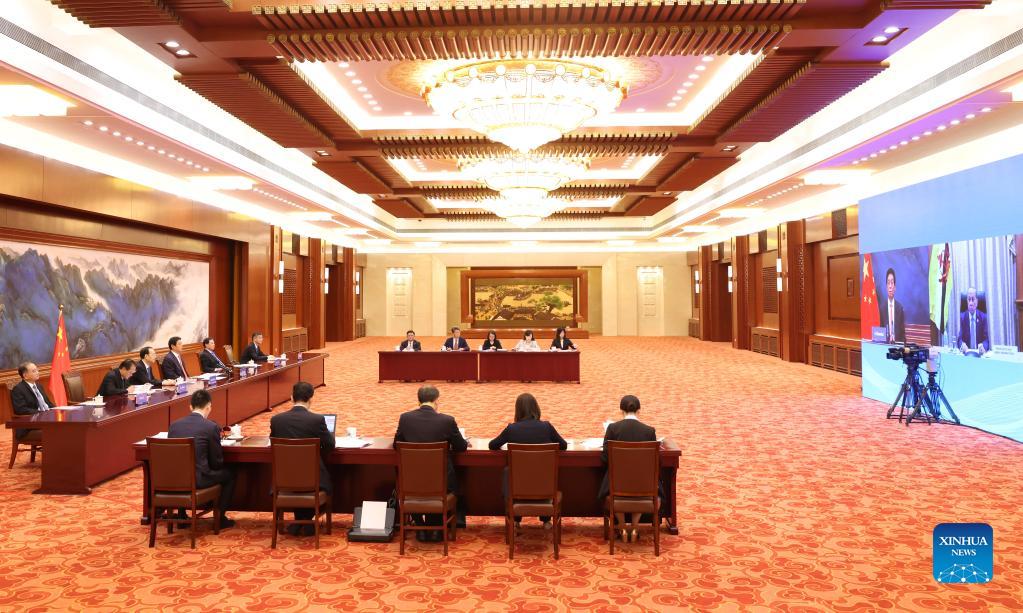 Li Zhanshu, chairman of the National People's Congress (NPC) Standing Committee, holds talks with Brunei's Legislative Council speaker Abdul Rahman via video link in Beijing, capital of China, Sept. 23, 2021. (Xinhua/Pang Xinglei)