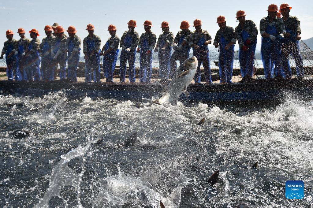 Workers harvest fishes with a huge fishing net from the Qiandao Lake in Chun'an County, east China's Zhejiang Province, Sept. 23, 2021. (Xinhua/Huang Zongzhi)