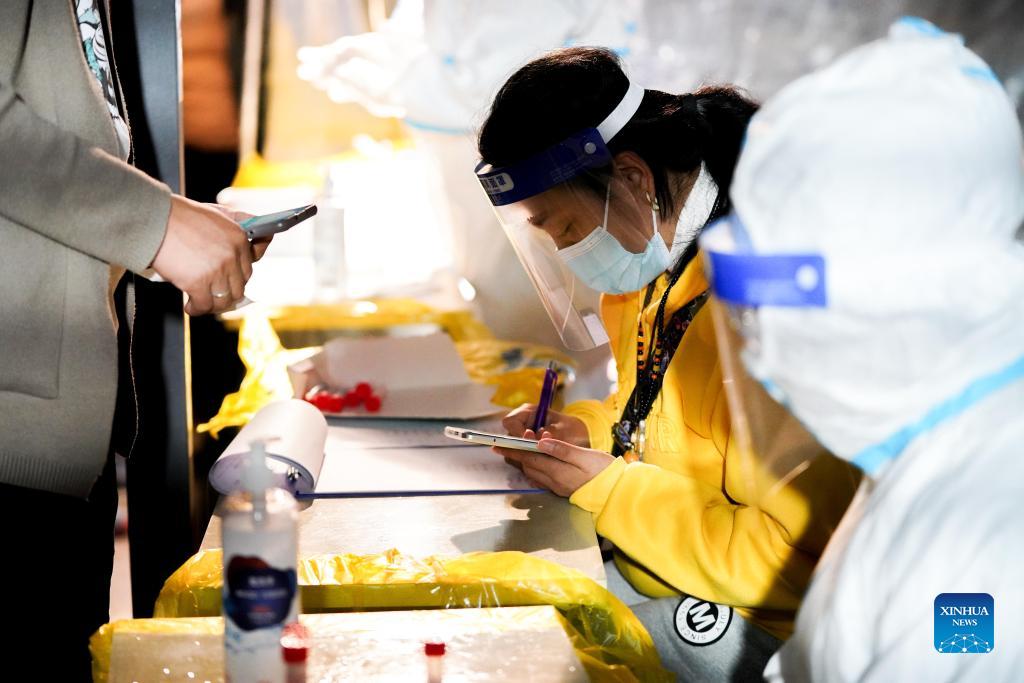 A community worker (C) registers information of residents at a nucleic acid testing site in Harbin, northeast China's Heilongjiang Province, Sept. 22, 2021. Harbin, with a population of more than 10 million, launched citywide nucleic acid testing on Tuesday afternoon and plans to complete the campaign by the end of Thursday, according to the city's COVID-19 prevention and control headquarters. (Xinhua/Wang Song)