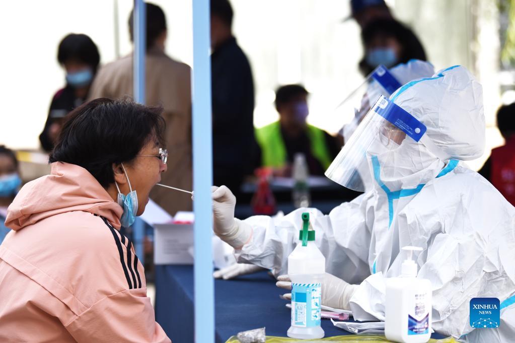 A medical worker collects swab sample from a woman for nucleic acid testing in Harbin, northeast China's Heilongjiang Province, Sept. 22, 2021. Harbin, with a population of more than 10 million, launched citywide nucleic acid testing on Tuesday afternoon and plans to complete the campaign by the end of Thursday, the headquarters said. (Xinhua/Wang Jianwei)