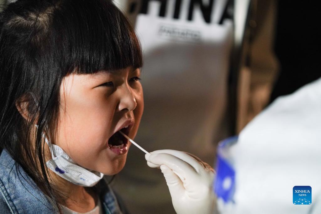 A resident receives a nucleic acid test at a testing point in Harbin, northeast China's Heilongjiang Province, Sept. 22, 2021. Harbin, with a population of more than 10 million, launched citywide nucleic acid testing on Tuesday afternoon and plans to complete the campaign by the end of Thursday, according to the city's COVID-19 prevention and control headquarters. (Xinhua/Wang Song)