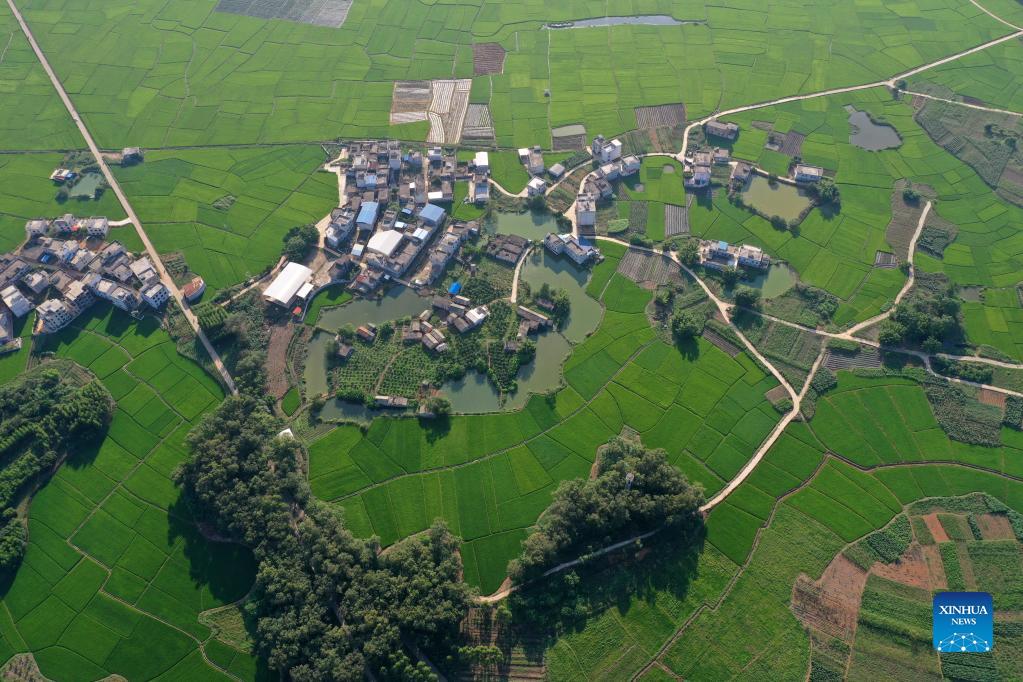 Aerial photo taken on Sept. 23, 2021 shows fields in Guliao Village of Binyang County, south China's Guangxi Zhuang Autonomous Region. (Xinhua/Huang Xiaobang)