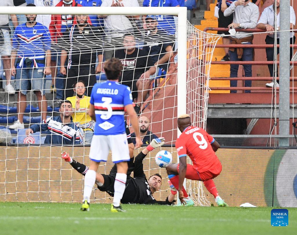 Napoli's Victor Osimhen (1st R) scores a goal during a Serie A football match between Napoli and Sampdoria in Genova, Italy on Sept. 23, 2021. (Str/Xinhua)