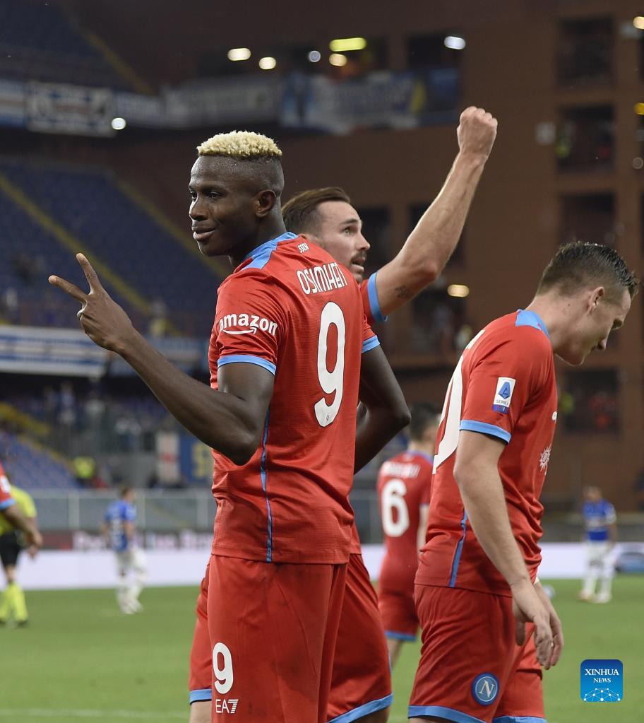 Napoli's Victor Osimhen (1st L) celebrates his second goal with his teammates during a Serie A football match between Napoli and Sampdoria in Genova, Italy on Sept. 23, 2021. (Str/Xinhua)