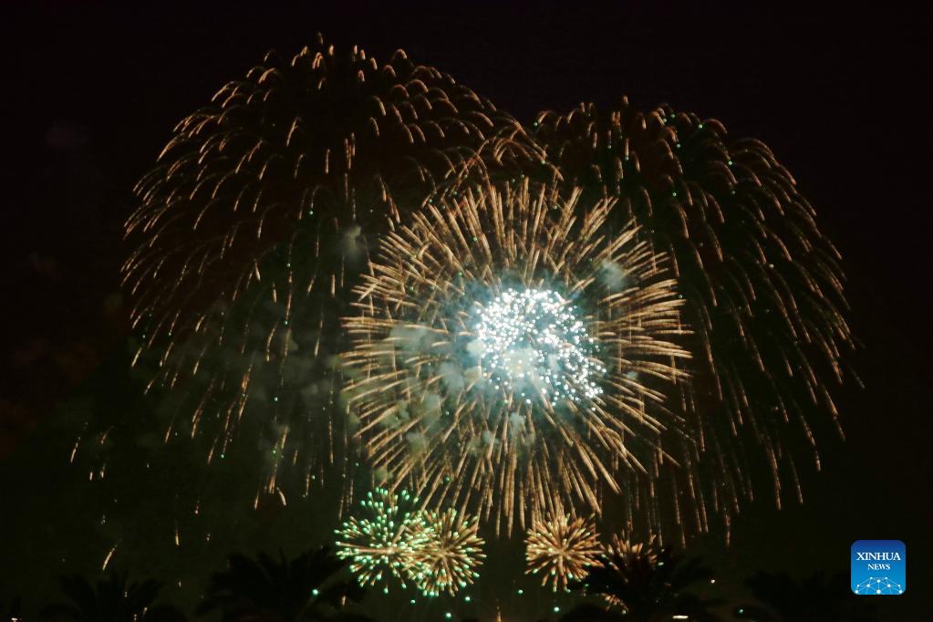 Photo taken on Sept. 23, 2021 shows the national day firework in the sky nearby the Al Diriyah in Riyadh, Saudi Arabia. (Xinhua/Wang Haizhou)