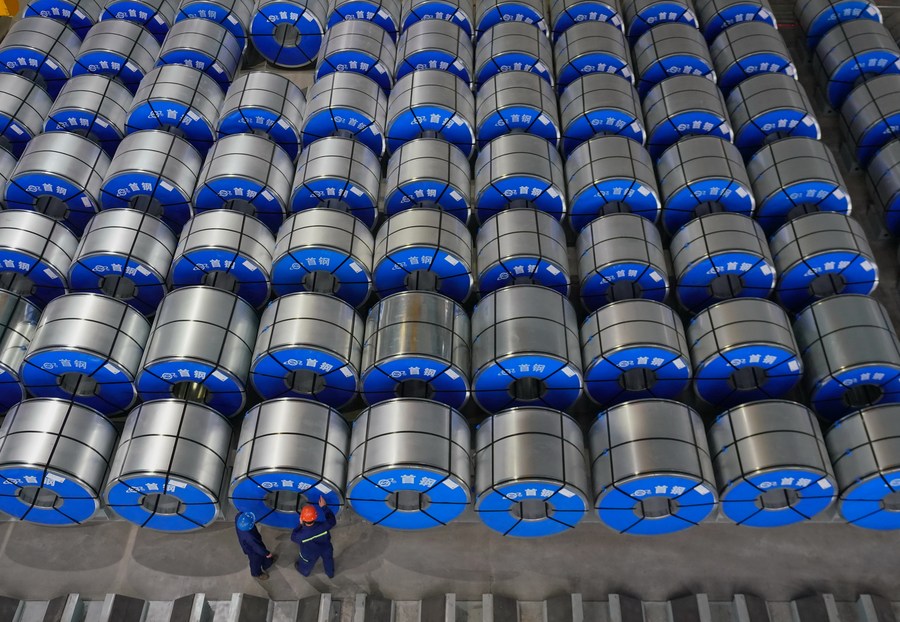 Workers operate at the finished products storage area of a workshop producing high-end automotive steel plates in a local subsidiary of the Shougang Group in Qianan City of north China's Hebei Province, May 22, 2020. (Xinhua/Yang Shiyao)