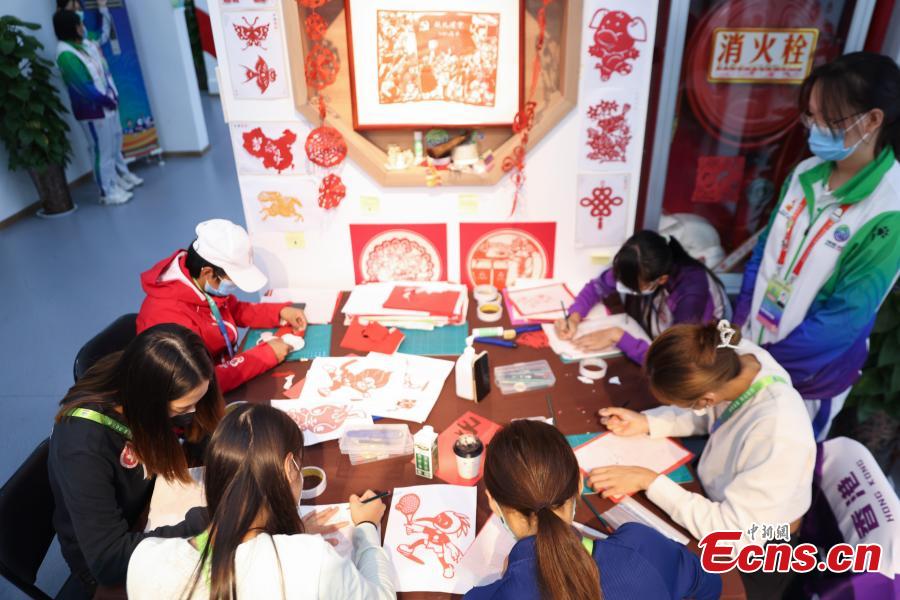 Hong Kong athletes try Shaanxi paper-cuts in the 14th National Games Village, Xi’an City of northwest China’s Shaanxi Province, Sept. 24, 2021. (China News Service/Jiang Qiming)