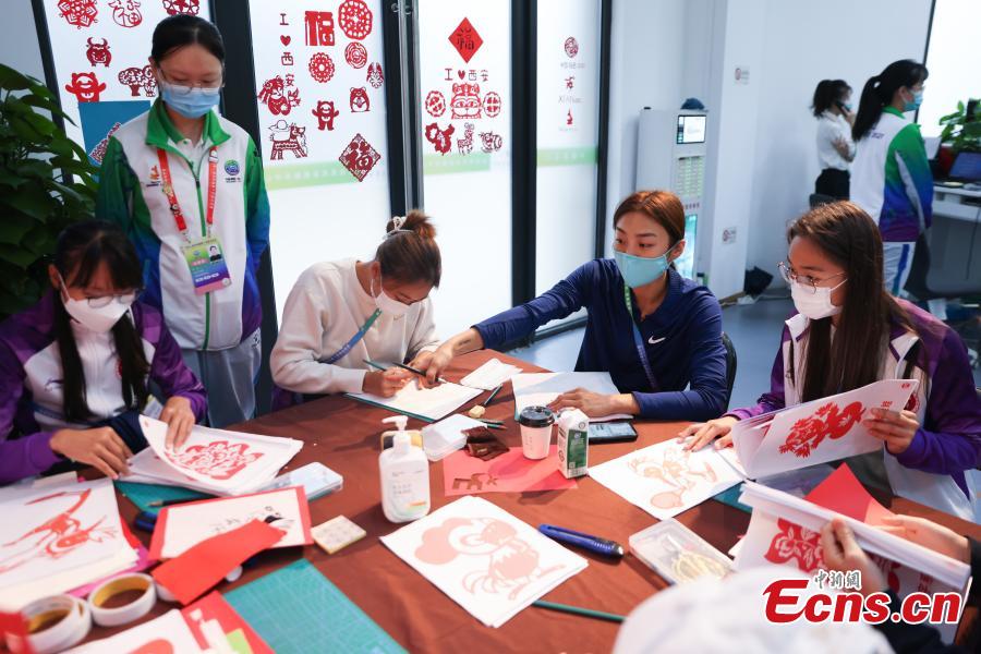 Hong Kong athletes try Shaanxi paper-cuts in the 14th National Games Village, Xi’an City of northwest China’s Shaanxi Province, Sept. 24, 2021. (China News Service/Jiang Qiming)