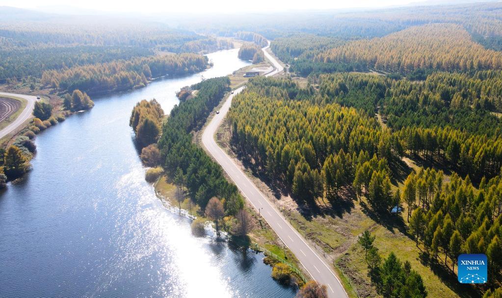 Aerial photo taken on Sept. 23, 2021 shows the autumn scenery of Saihanba forest farm in north China's Hebei Province. (Xinhua/Jin Haoyuan)