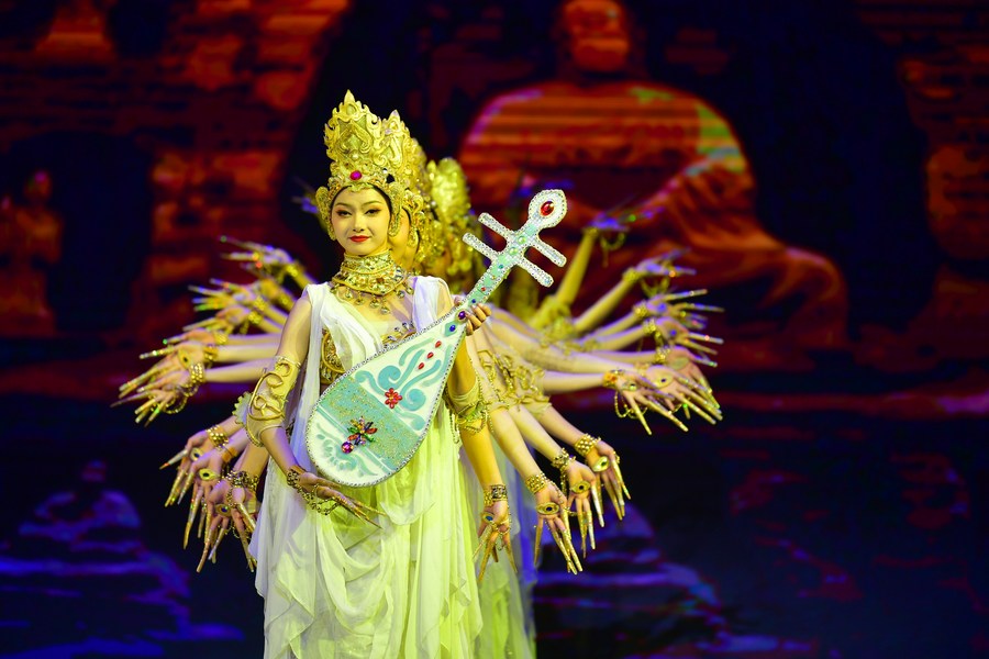Photo taken on Sept. 24, 2021 shows artists performing at the opening ceremony of the 5th China Silk Road (Dunhuang) International Cultural Expo and the 10th Dunhuang Tour-Silk Road International Tourism Festival in Dunhuang, northwest China's Gansu Province. (Xinhua/Chen Bin)