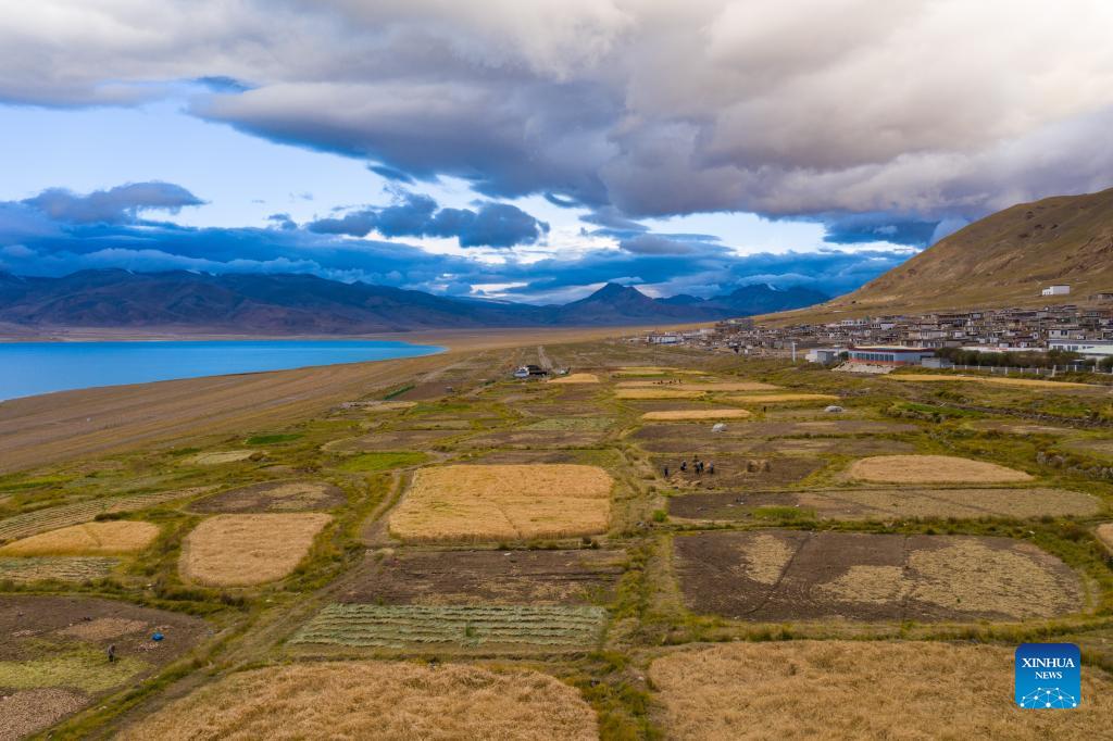 Aerial photo taken on Sept. 23, 2021 shows villagers harvesting highland barley at Ombu Township, Nyima County, Nagqu City of southwest China's Tibet Autonomous Region. In the plateau county of Nyima, the yearly average temperature stays at minus four degrees Celsius and herding is the main walk of life for most of its residents. But there is one exception -- Ombu Township where two major lakes, Tangra Yumco and Tangqung Co, help create a rare climate for farming in the grasslands. It is also a reason behind such a vast field of highland barley, rarely seen in north Tibet. (Xinhua/Sun Ruibo)